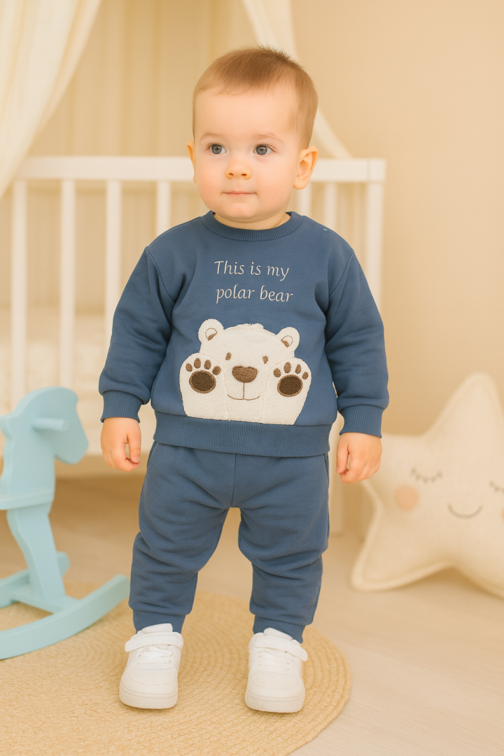 Presladak i udoban komplet za dečake idealan je za svakodnevno nošenje kod kuće, u šetnji ili vrtiću. Napravljen je od prijatnog pamuka koji obezbeđuje udobnost i slobodu pokreta tokom cele dana. Gornji deo krasi simpatičan polarni meda koji daje posebnu notu šarma i razigranosti. Krem boja je nežna i elegantna, lako se kombinuje sa drugim komadima garderobe.