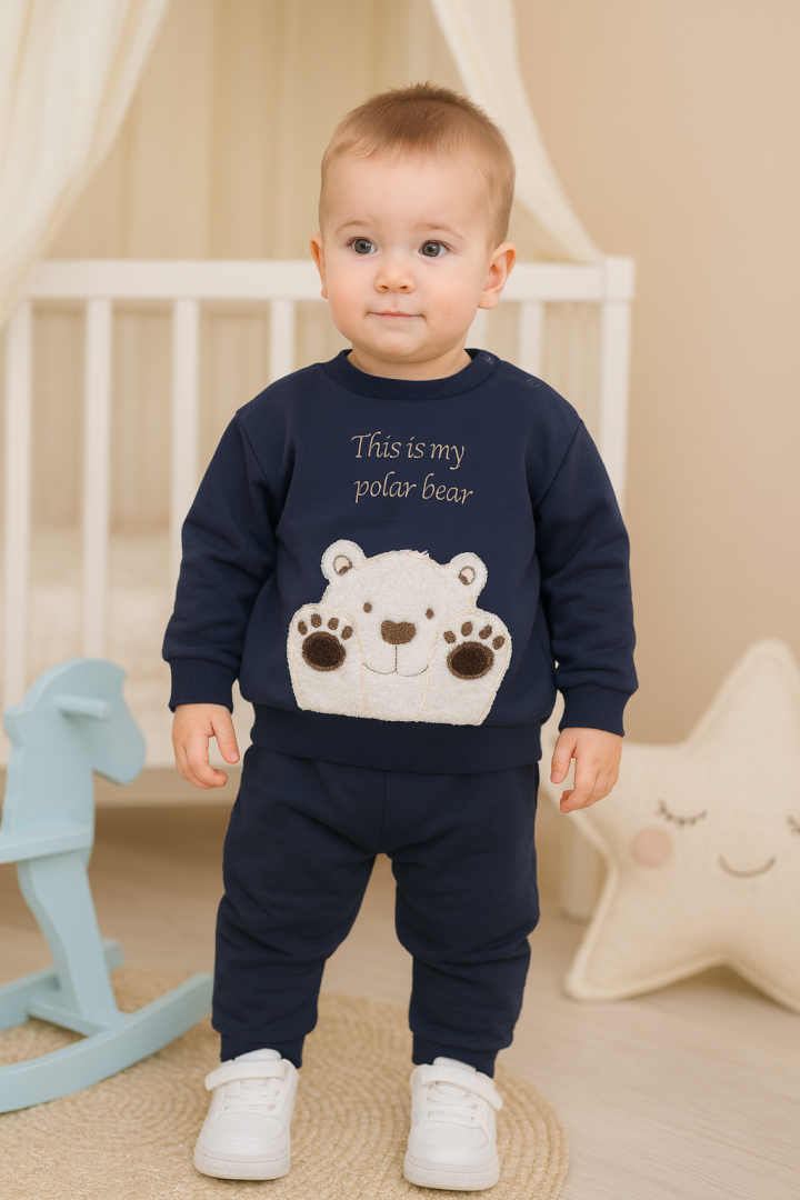 Presladak i udoban komplet za dečake idealan je za svakodnevno nošenje kod kuće, u šetnji ili vrtiću. Napravljen je od prijatnog pamuka koji obezbeđuje udobnost i slobodu pokreta tokom cele dana. Gornji deo krasi simpatičan polarni meda koji daje posebnu notu šarma i razigranosti. Tamno teget boja je praktična i lako se kombinuje sa drugim komadima garderobe.
