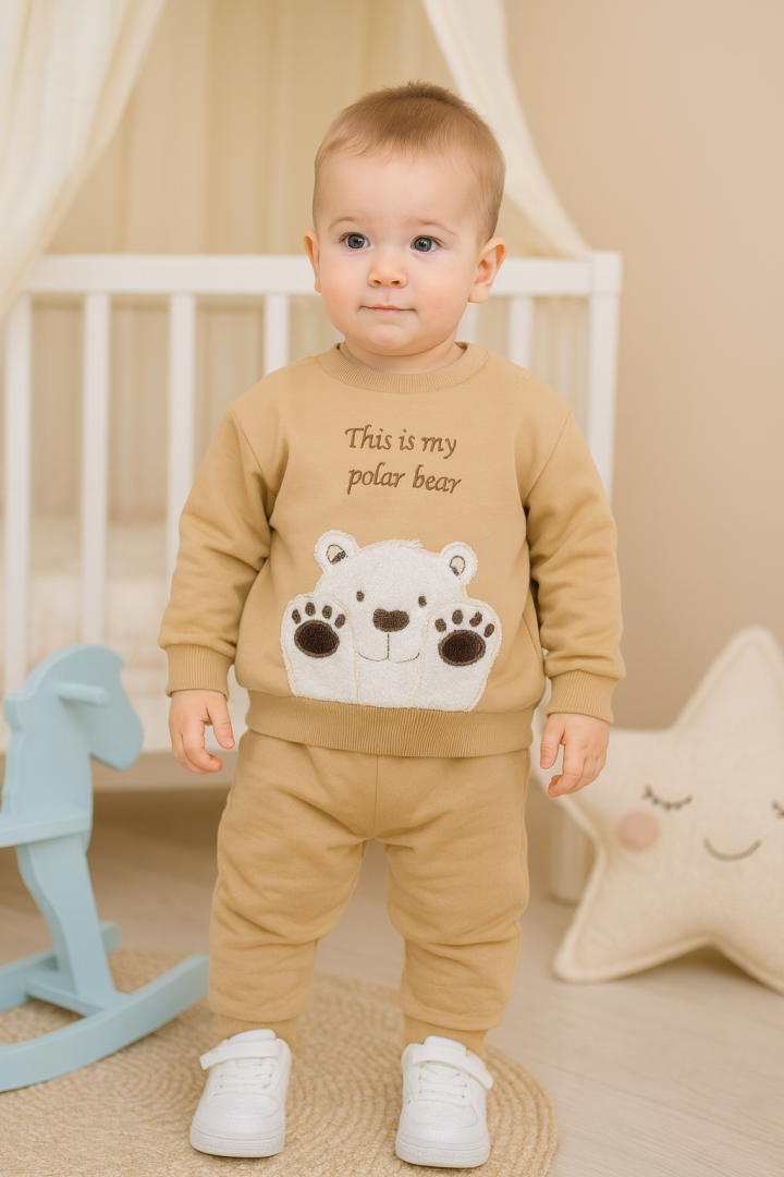 Presladak i udoban komplet za dečake idealan je za svakodnevno nošenje kod kuće, u šetnji ili vrtiću. Napravljen je od prijatnog pamuka koji obezbeđuje udobnost i slobodu pokreta tokom cele dana. Gornji deo krasi simpatičan polarni meda koji daje posebnu notu šarma i razigranosti. Krem boja je nežna i elegantna, lako se kombinuje sa drugim komadima garderobe.